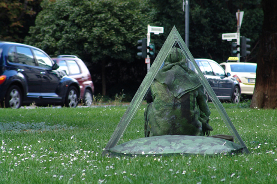 Idee und Konzept für guerilla_exil hat die Künstlerin Ursula Kreutz aus ihrer bisherigen Arbeit heraus organisch entwickelt. Ihre geplante, performative wie installative Intervention im Stadtraum betitelt die Künstlerin, die bevorzugt textiles, aber möglichst transparentes Material verwendet, mit zwei Begriffen, die im Kunstdiskurs unserer Zeit unterschiedliche Gewichtung haben: Während Abweichung als Methode im Kampf um die Ressource Aufmerksamkeit so alltäglich wurde, dass die Werbewirtschaft mit Guerilla-Marketing und ähnlichem die künstlerischen Handlungsmuster längst landauf, landab erfolgreich kopiert, ist das – insbesondere freiwillig gewählte – Exil keine übliche Form künstlerischen Auftretens. Das Exil, das hier gemeint ist, deckt sich mehr oder weniger mit Klausur, Askese, Camouflage und Sich-verbergen, Haltungen, die jüngere Künstler nicht unbedingt bevorzugen. Im Sommer 2010 gab es in einem Waldstück eines Nürnberger Naherholungsgebietes eine mehrwöchige Begegnung zwischen Künstlern aus Nürnberg und Kollegen aus anderen deutschen Städten, sowie aus Japan, Korea, Russland, Italien. Das Symposium wurde von einer größeren Ausstellung abgerundet. Ursula Kreutz entschied sich bei ihrer Beteiligung für ihre Form eines Exils. Motto und Ausführung (ein lichtdurchlässiges Tarnzelt markierte den Ort für eine mehrfach abgewandelte Performance, die Künstlerin verschmolz mit ihrer Tarnkleidung mit der Umgebung etc.) waren im besten Sinne situations- und ortsbezogen. Der Mythos vom Wald verbindet sich eng mit der Vorstellung vom Verschwinden, vom Weggehen aus der Zivilisation. Ein ähnliches Unterfangen im Stadtraum wirkt paradox. Möglich, dass es eher zu Reaktionen und ungewöhnlichen, subtilen Formen der Kommunikation kommt, als bei einer expressiv-aggressiven künstlerischen Intervention. Diese Möglichkeit zu eröffnen, ist Intention von Ursula Kreutz, die in ihrem Konzept die Beobachtung des möglichen Beobachters mitdenkt. (Text Hans-Peter Miksch, Fotografien Cornelia Genschow) 2013