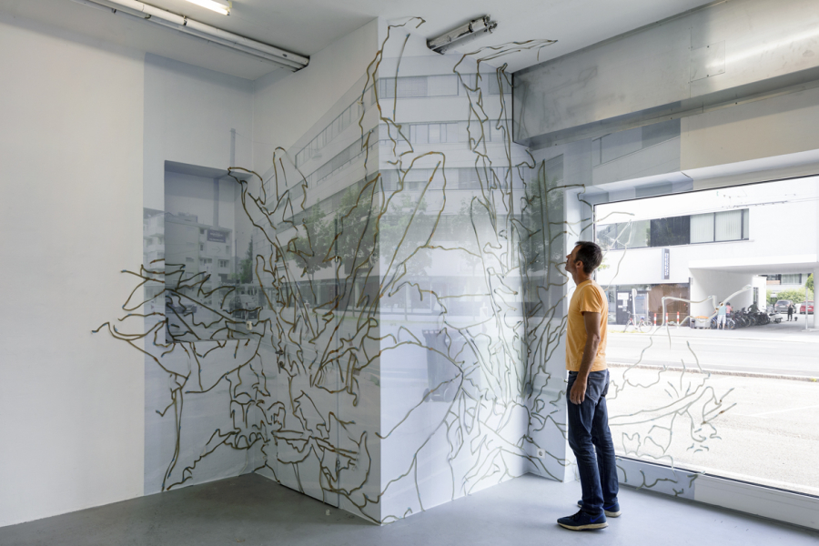 »taraxacum_p«, Installation im periscope-Projektraum Salzburg, Papierfotodruck, Papierzeichnung, Klebeband, 400 x 300 cm, (Fotografien Andrew Phelps) 2019